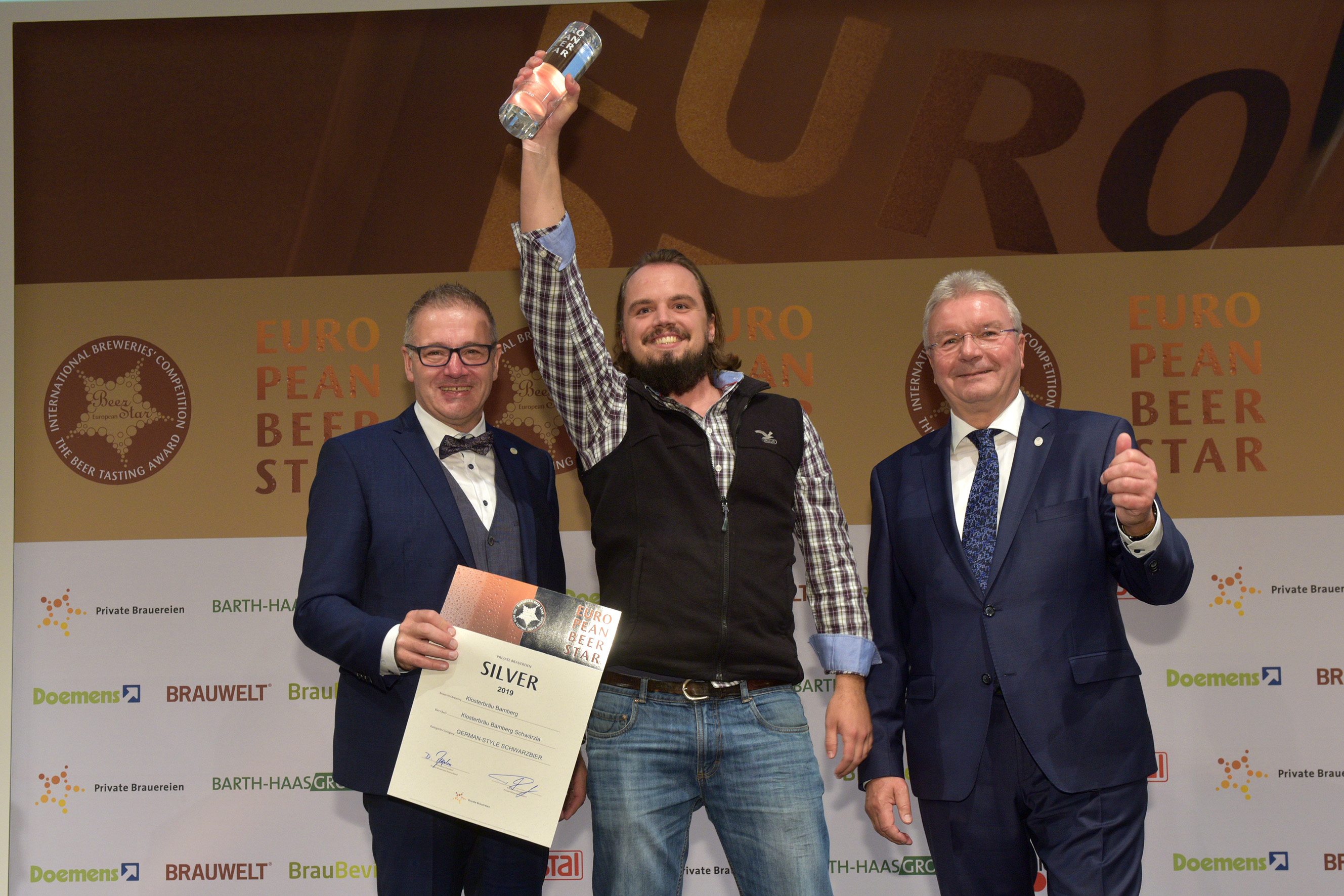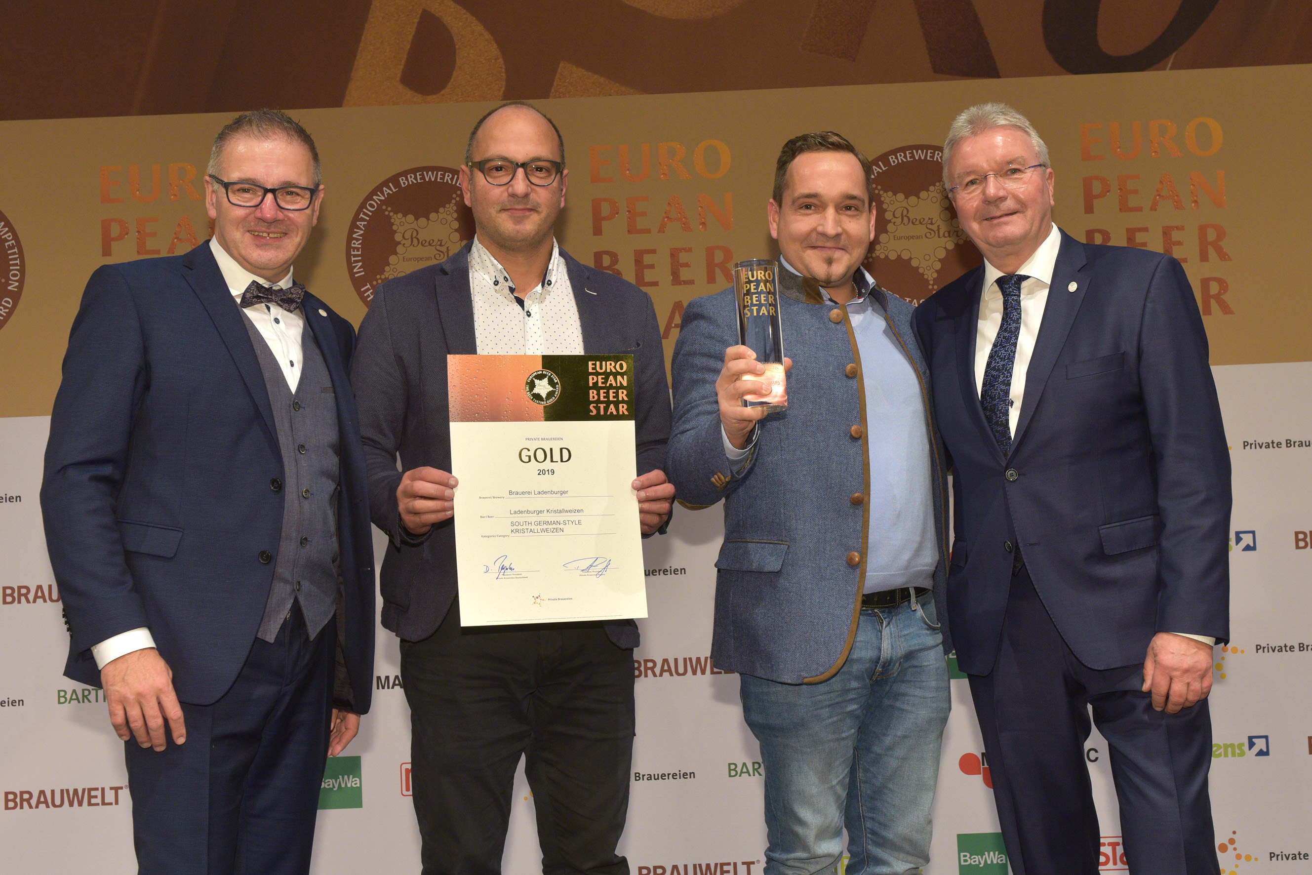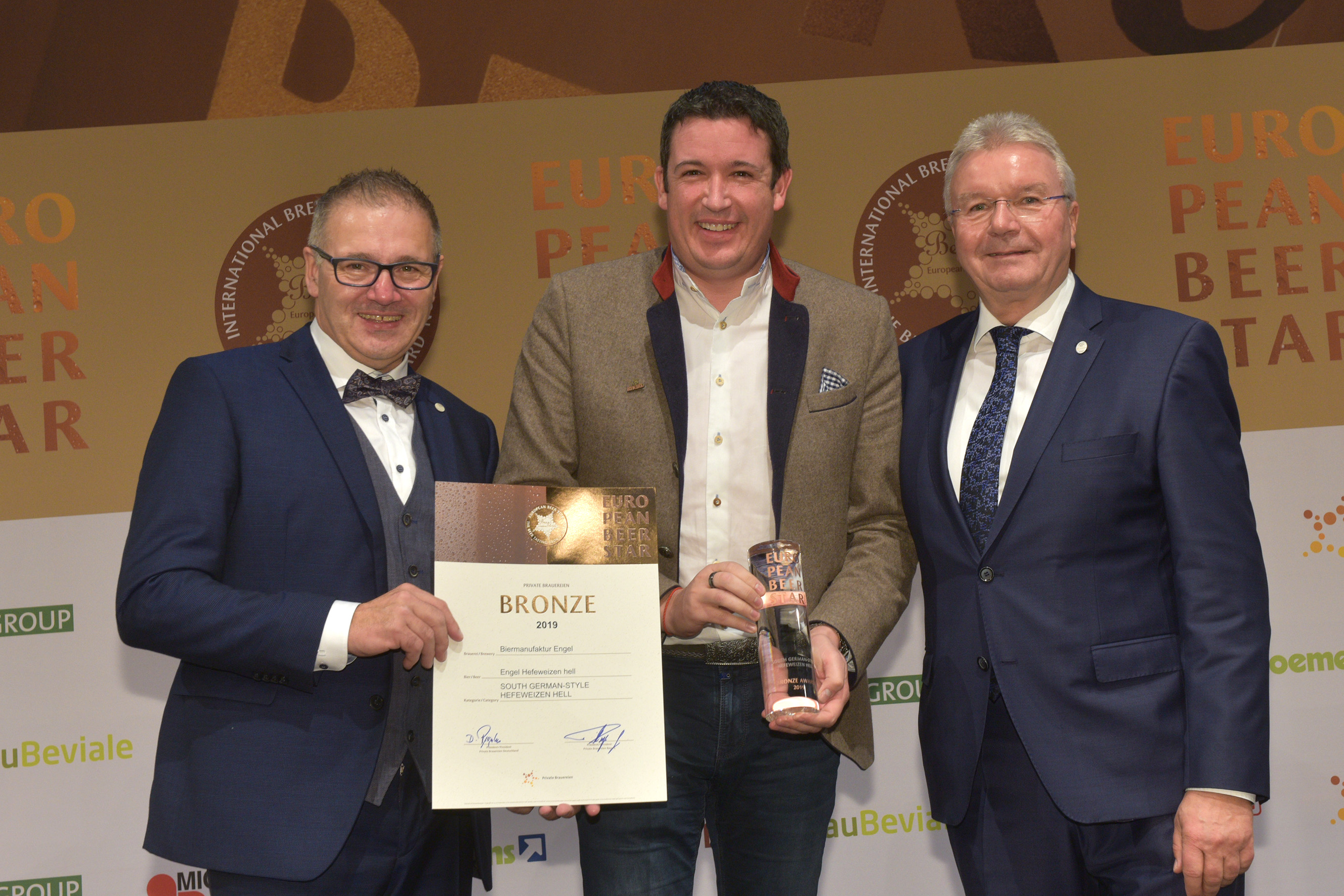 EUROPEAN BEER STAR AWARD 2019 überreicht von: links: Georg Rittmayer, Präsident der Privaten Brauereien Bayern e.V. rechts: Detlef Projahn, Präsident der Privaten Brauereien Deutschland e.V.
